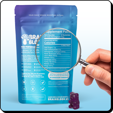 BrainBloom is a premium daily performance gummy designed to support focus, mental clarity, mood balance, and overall cognitive function. Each serving delivers 2,600mg of functional mushrooms, made from 10:1 concentrated organic fruiting body extracts — providing a powerful, natural, caffeine-free boost without jitters or crashes.